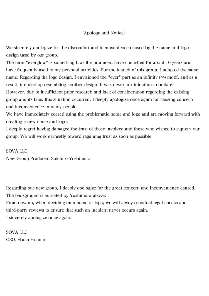 No entanto, devido a uma pesquisa prévia insuficiente e falta de consideração em relação ao grupo existente e seus fãs, essa situação ocorreu. Peço desculpas novamente por causar preocupação e inconveniência a tantas pessoas.