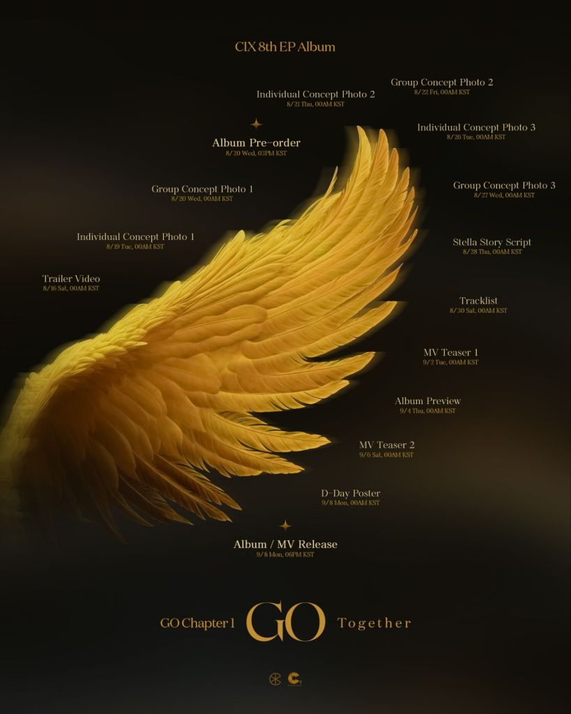 À meia-noite (KST) do dia 14 de agosto, o CIX anunciou oficialmente a data e os detalhes de seu comeback no mês que vem. O grupo retornará com seu oitavo EP, “‘GO’ Chapter 1: GO Together”, às 18h (KST) do dia 8 de setembro.