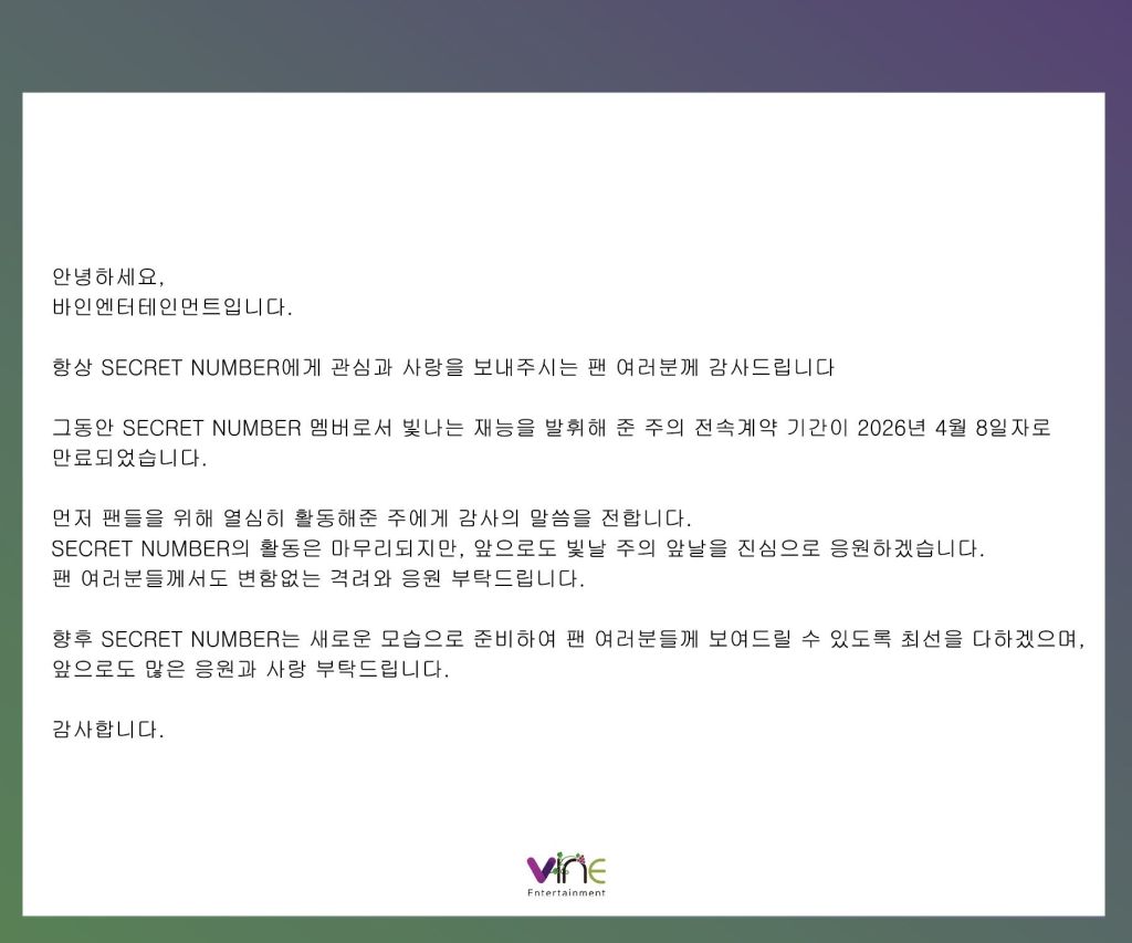 Primeiramente, gostaríamos de agradecer à Zuu por sua dedicação aos fãs. Embora suas atividades como SECRET NUMBER tenham chegado ao fim, apoiamos sinceramente os projetos futuros da Zuu e pedimos aos fãs que continuem a oferecer seu apoio e incentivo.
